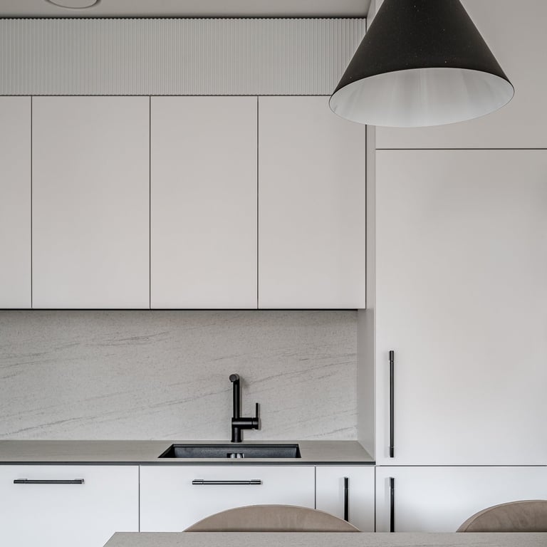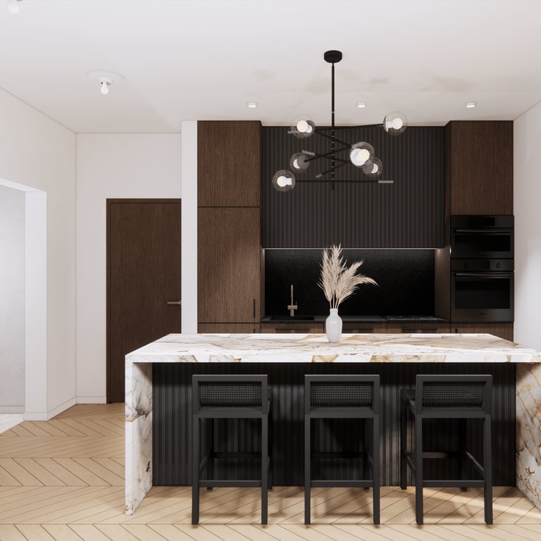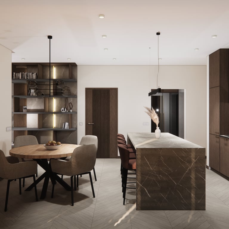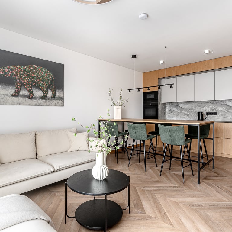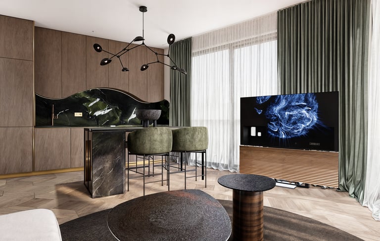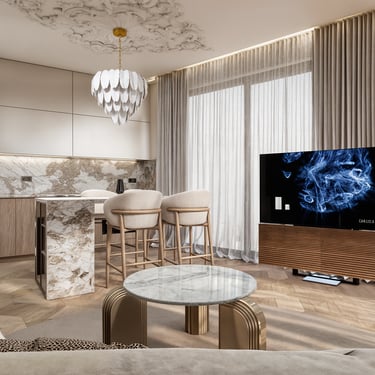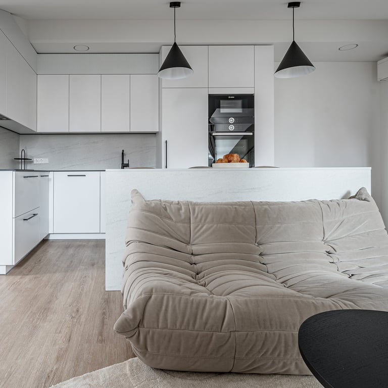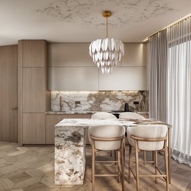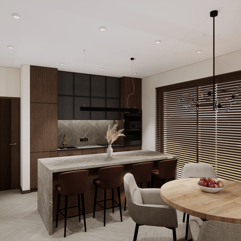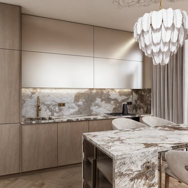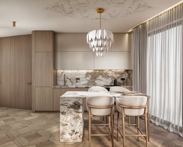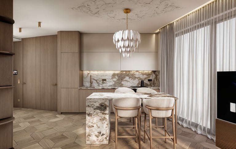 Rinkdamasi interjero sprendimus, daug dėmesio skyriau natūralių medžiagų pasirinkimui, šviesos balansui ir erdvės proporcijoms. Marmuro akcentai, šiltos medienos tekstūros, minkšti audiniai ir apgalvotas apšvietimas sukuria harmoningą aplinką, kurioje estetika dera su kasdienio gyvenimo patogumu.