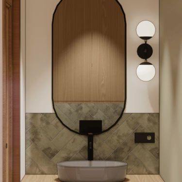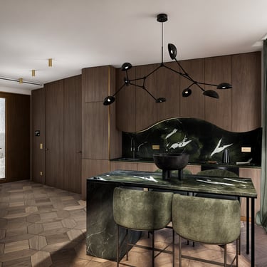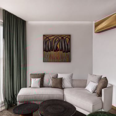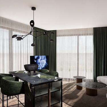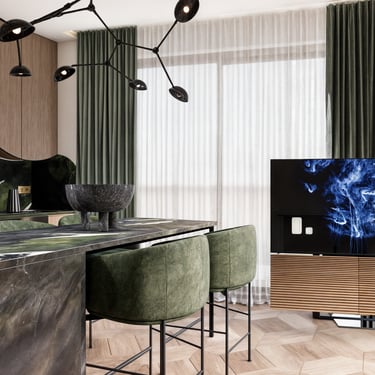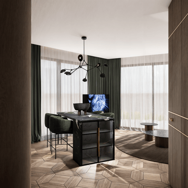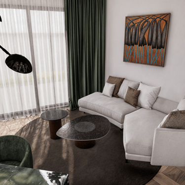 Tai interjeras, kuriame susilieja drąsa ir subtilumas. Pagrindą kuria sodrios, gilios spalvos – prigesinta samanų žalia, tamsus medis ir akcentiniai netikėtai besiliejantys atspalviai. Organinės, banguojančios formos suteikia lengvumo ir dinamikos, o išraiškingos faktūros sukuria taktilinį pojūtį. Erdvės akcentu tampa Živilės Rudzikaitės Matuzonienės paveikslas Gervės XI – jis įneša meninį charakterį, subtiliai išplėsdamas gamtos ir judesio temą interjere bei sukeldamas harmonijos ir laisvės pojūtį.