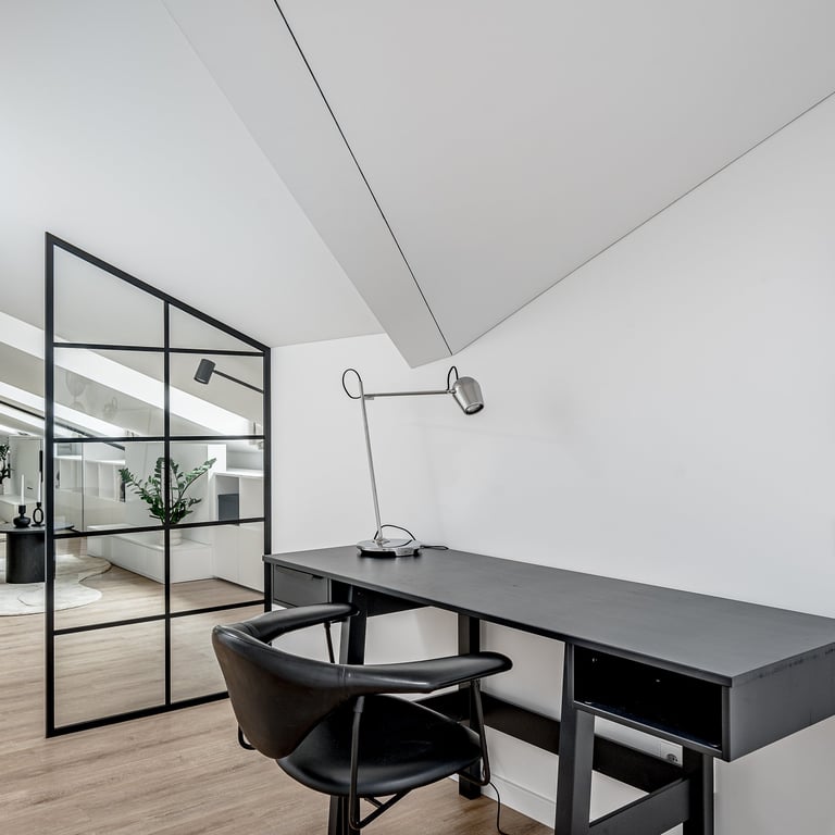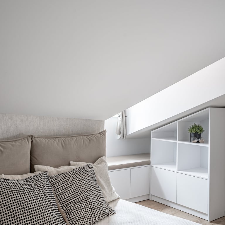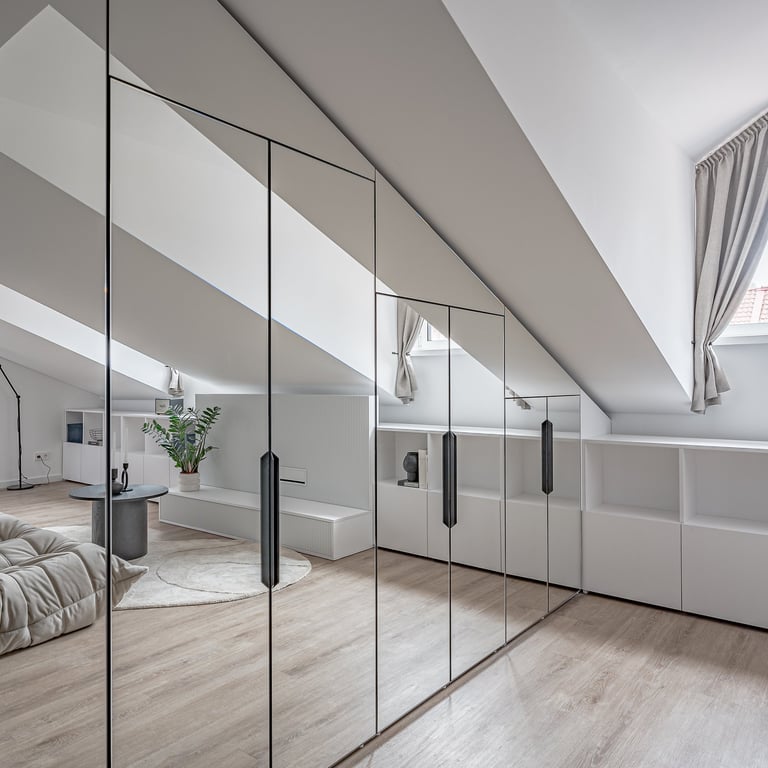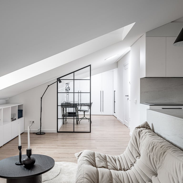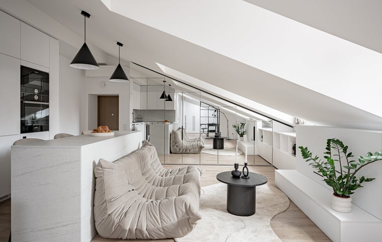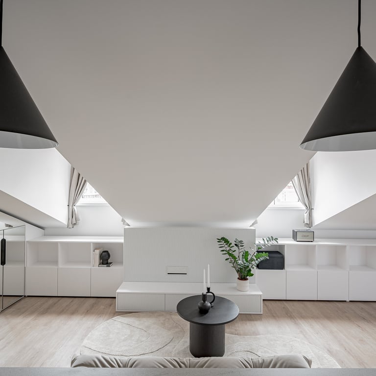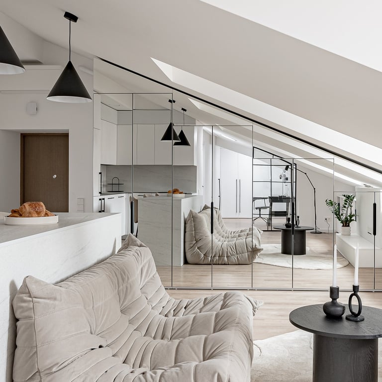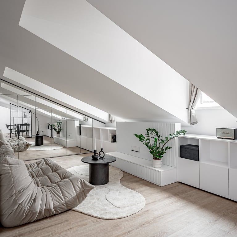 Palėpinis butas, kuriame nėra nei vieno standartinio sprendimo. Šviesus ir jaukus butas, kurtas stilingai miesto asmenybei. Nors butas yra modernus, jame jaučiama senamiesčio dvasia. Veidrodžių panaudojimas padidina erdvę ir atspindi šviesą.