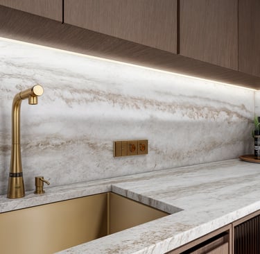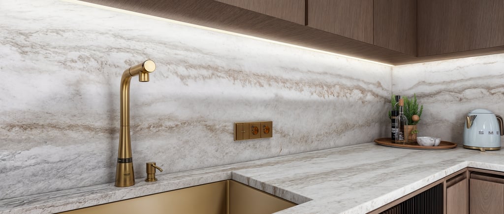 Medžiagiškumas: naudojamos lengvos, taktiliškai malonios plokštės, marmuro imitacijos paviršiai, subtilūs tekstūriniai akcentai.
